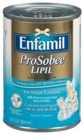 Enfamil ProSobee Lipil Concentrated Liquid - 13 oz can - 12 PackSoy-based, milk-free formula for when a soy formula is preferred.No other soy formula has been shown to solve common feeding problems more effectively than Enfamil ProSobee LIPIL.-Milk-free and lactose-free -Sucrose (table sugar)-free -Carbohydrate-sweetness levels similar to lactose, the main carbohydrate found in breast milk1 -Includes LIPIL, our blend of DHA and ARA, two nutrients also found in breast milk that promote brain and eye development